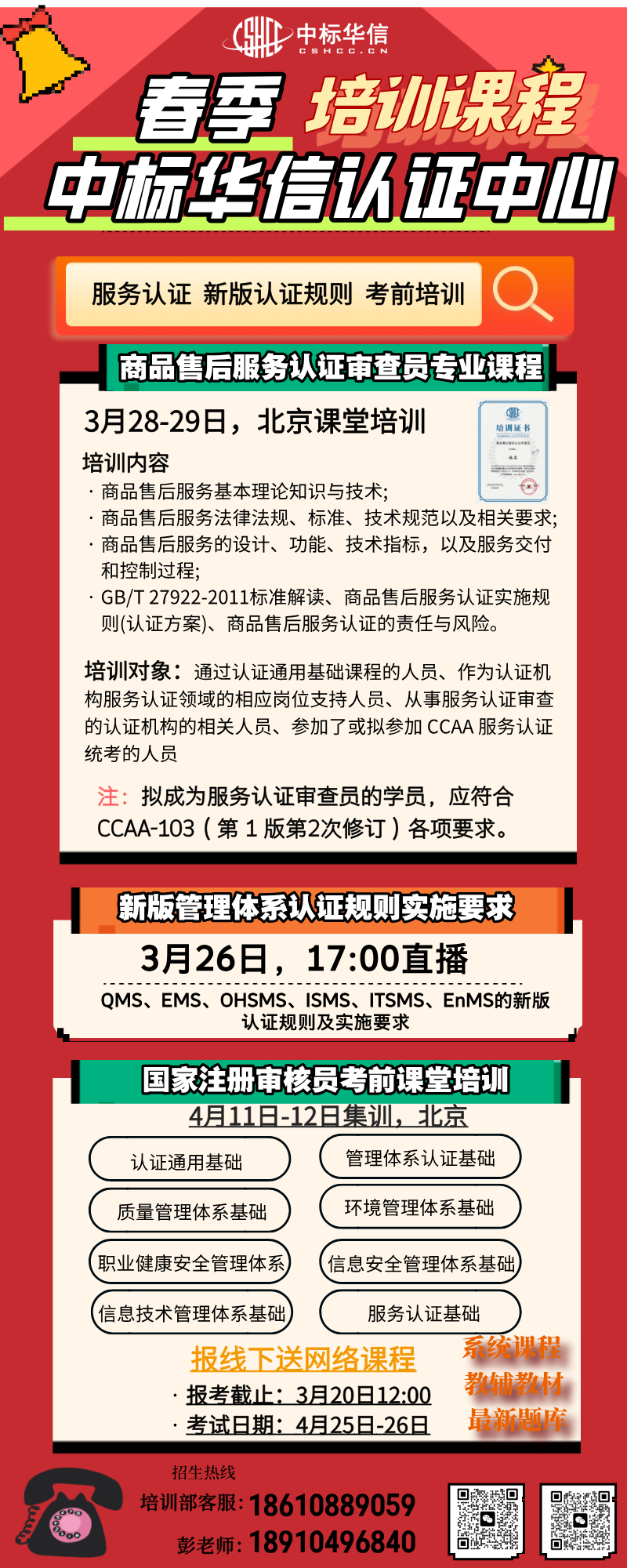 中标华信3月和4月培训课程#服务认证#审核员考前培训#新版管理体系
